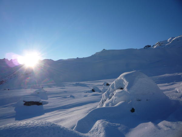 Verhältnisse sind gut. Lediglich kurz nach der schönen Abfahrt ins Valzifenztal muss man etwas vorsichtig sein, da immerwieder Steine oder Draht von einem Zaun wenig unterhalb der Schneedecke verborgen sind.