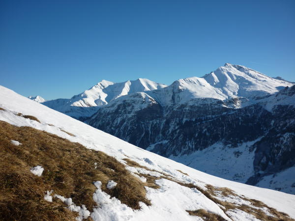 Bis auf ca. 2200m fehlt die Unterlage. Darüber mehrheitlich Powder. Im Gipfelbereich teilweise verblasen, hartgepresster Deckel.