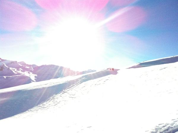 Grat Trittschnee, in der Abfahrt noch Powder vorhanden, teils Windgepresst.
