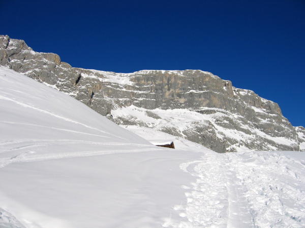 Vom Parkplatz zuerst der Piste folgend und danach immer die richtige Spur und Abzweigung wählend ohne Probleme bis zum Beginn des Gamstobels. Kurzes Stück die Ski hochtragen (guter Trittschnee)und danach durch das wenig verschneite Tobel bis zum Gipfel. Im Gamstobel wechselt der Schnee sehr schnell zwischen Pulver ohne Unterlage und eisig hart. Steinkontakt ist in der unteren Hälfte des Gamstobels im Aufstieg wie in der Abfahrt kaum zu vermeiden.