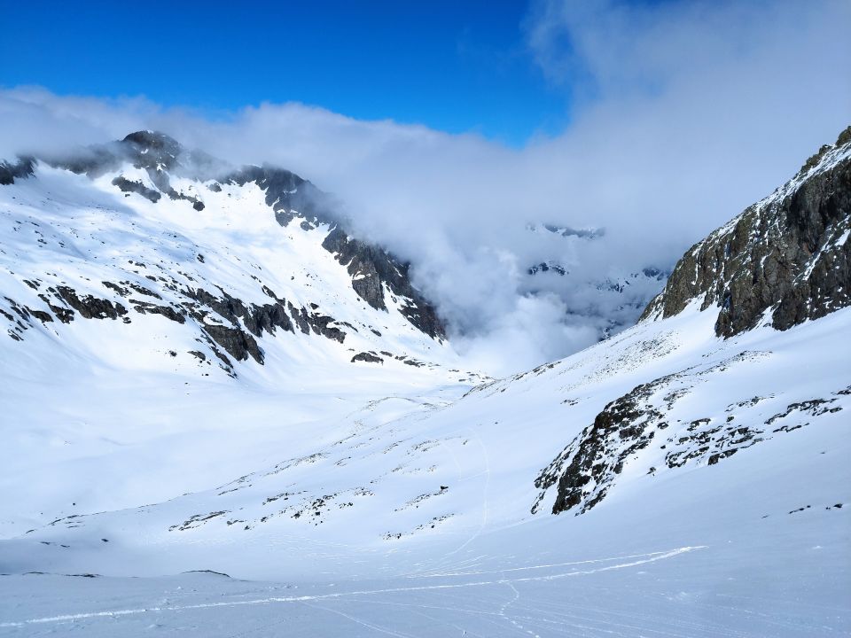 Oberhalb 2000m hat's ca. 5cm Neuschnee gegeben, die Verhältnisse waren deutlich besser und die Aufstieg zum Skidepot ging sehr gut.