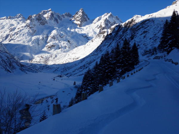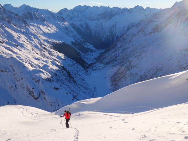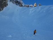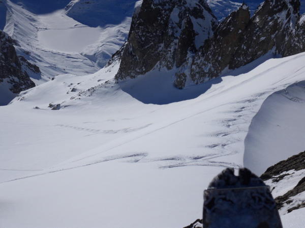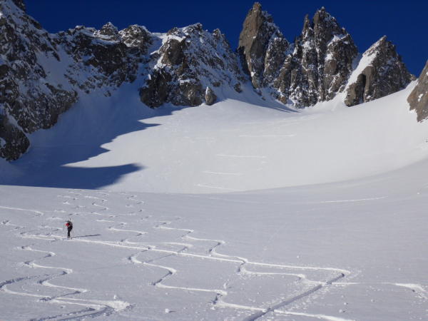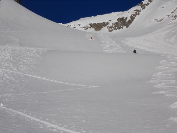 Pulver mit wenig Windharst Gletscher gut eingeschneit kein Mensch weit und breit.