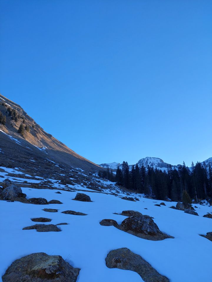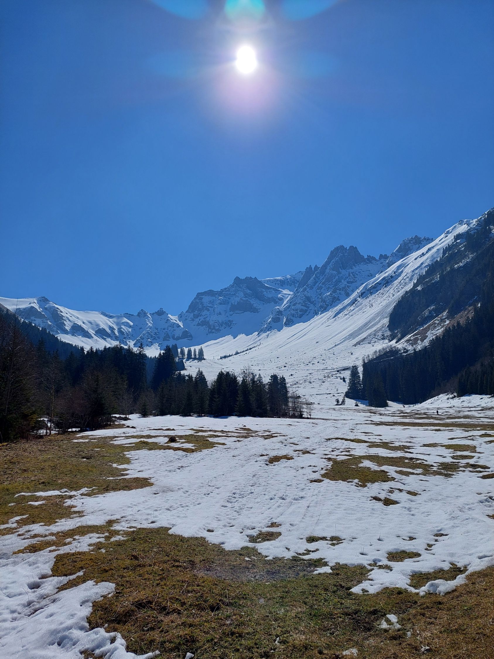 Abfahrt: Der Gipfelhang oben hart unten Sulz. Unterhalb querte ich Richtung Erbithore und immer linkshaltend das Tal hinaus. Ich habe von Pulver, Sulz und Hart alles angetroffen. Der Steibode ist hart. Unten hat der Steibode nicht mehr viel Schnee. Siehe Bilder.