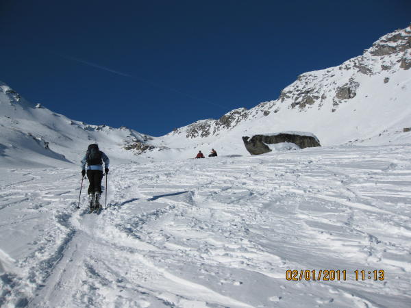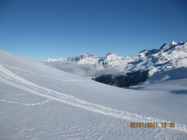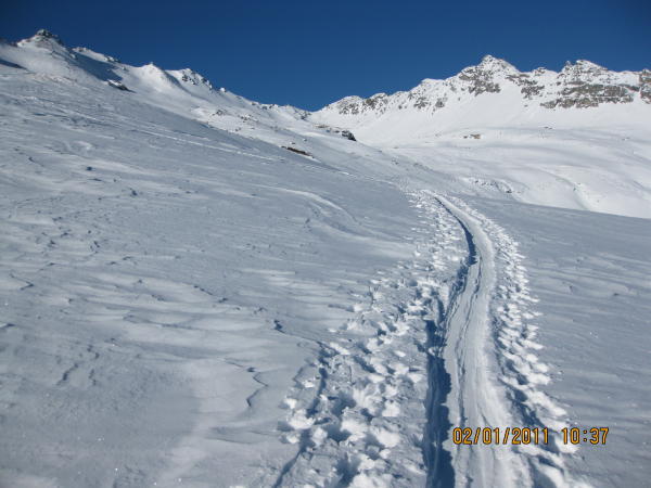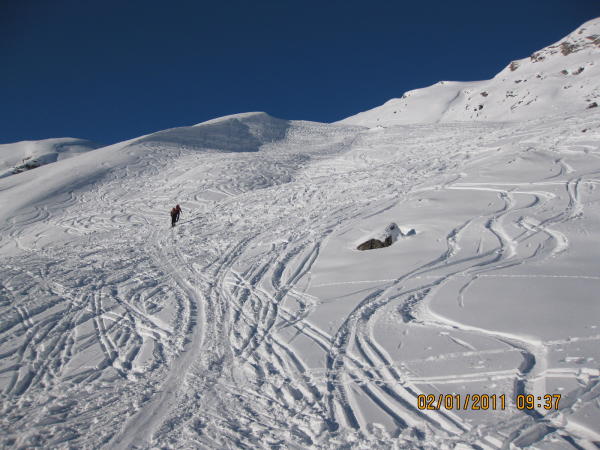 Die Gegend ist gut eingeschneit. Steinkontakt ist aber möglich. Ausser Nassschnee oder Sulz ist von allem etwas zu haben: Verfahrenes, leicht gedeckeltes, windgepresstes, tragend gefrorenes. Einige Schwünge im eher raren Pulver lagen auch drin.