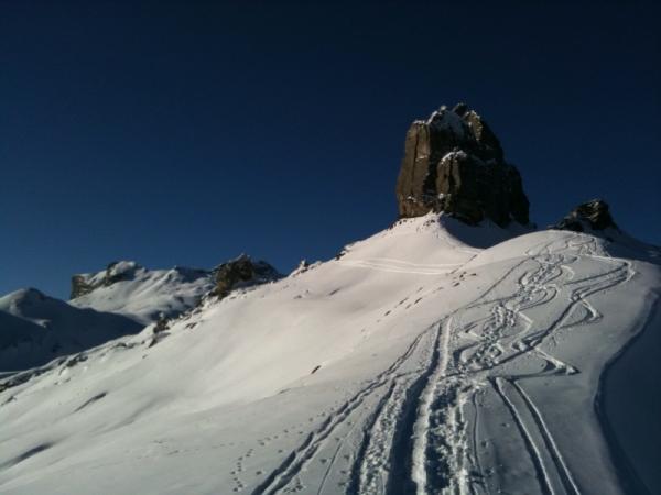 Bin nach einigen Schwüngen im super Powder nochmals bis an die Felsen unterhalb "Pt. 2736" zwischen Hoganthorn und Drättehorn aufgestiegen ;-)