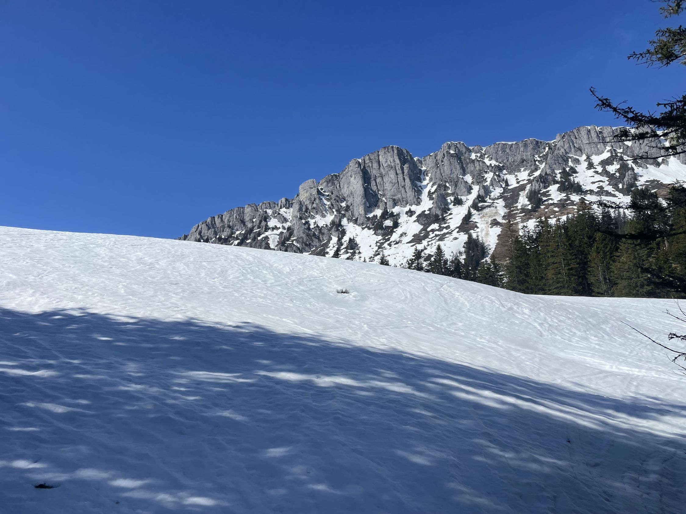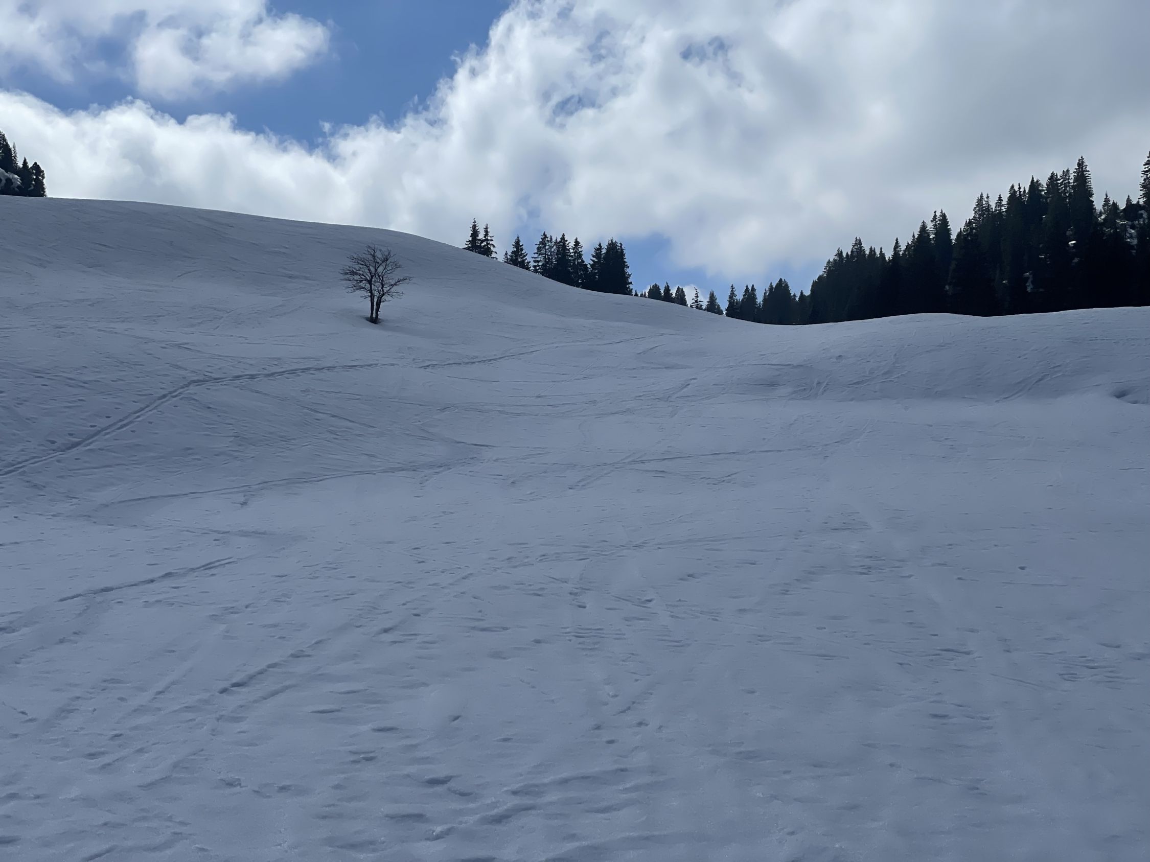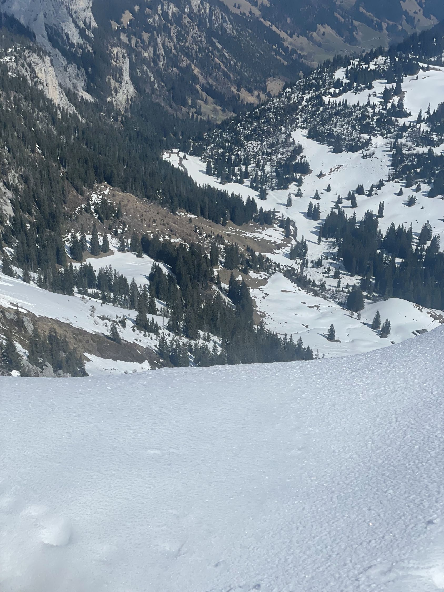 Man kann jetzt mit dem Auto etwas weiter hoch fahren, bis zur ersten scharfen Kurve, wo die Abkürzung abzweigt. Diese ist nun aper und gut begehbar, danach kann man anfellen. Wetter mehrheitlich sonnig. Der Schnee war erfreulicherweise firnig und umgewandelt. Ich war aber spät dran, Start vor 11. Aufstieg problemlos, eine Stelle unterhalb Chäli ist etwas ausgeapert, dort sah ich die ersten Krokus. Dann wieder prima bis zum Gipfel. Ich traf unterwegs zwei nette Tourengänger bei Obergestelen, die mir erzählten, es habe bis halb11 stockdicken Nebel gehabt. Sie nutzen das bessere Wetter für den Puur. Insofern hätte ein früherer Aufbruch nichts gebracht. Nach kurzer Rast oben genoss ich brillante Firnverhältnisse bis ins Flache bei Obergestelen. Dann kurz einsinkend, unterhalb Obergestele erstaunlicherweise wieder tragend bis zur Strasse.