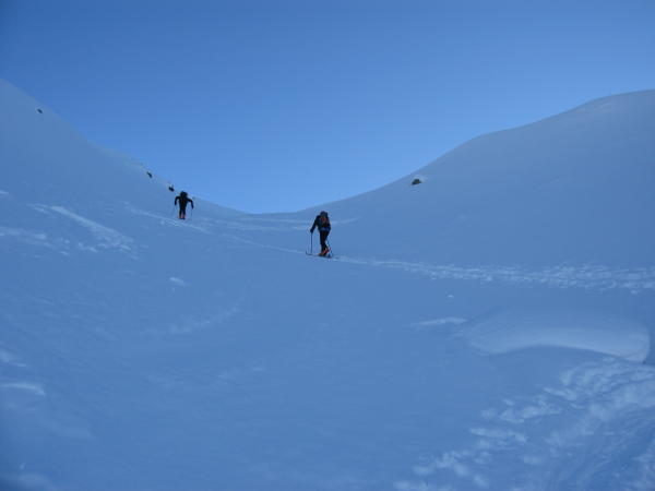 Heute genossen wir eine fantastische Fernsicht und guten Pulverschnee. Nach sonniger Gifelrast stürtzten wir uns wieder in den Gefrierschrank hinunter, vereinzelt muss man im Mittelabschnitt eine vorrausschauende Abfahrt wählen, sie garantiert dann keinen Kratzer im Ski.