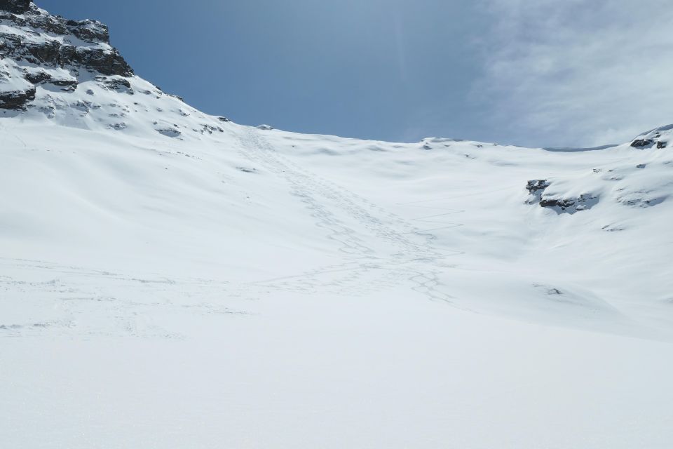 Auf guter Spuranlage bis zum Gipfel. In der Abfahrt bis 2200hm top Verhältnisse, Pulver und nur wenige Abfahrtsspuren.