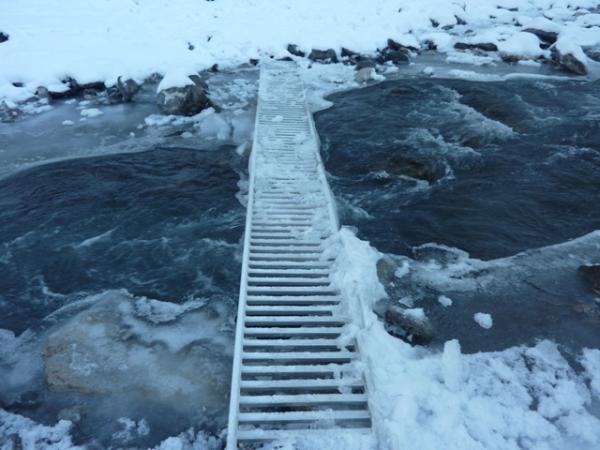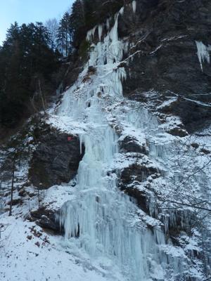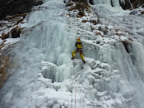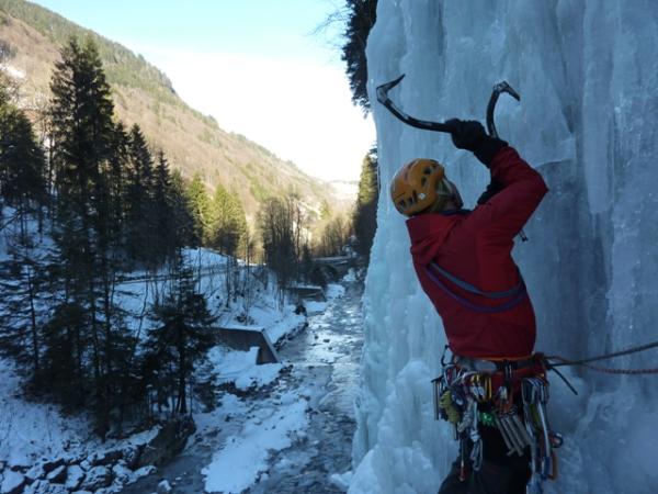 Es hat Eis im Gebiet aber es war warm. Reichlich Wasser kam uns entgegen, besonders im oberen Bereich (Ausstieg Säulen) Aber einige Routen sind gut kletterbar. Bach ist nur mit Leitern zu überqueren möglich.