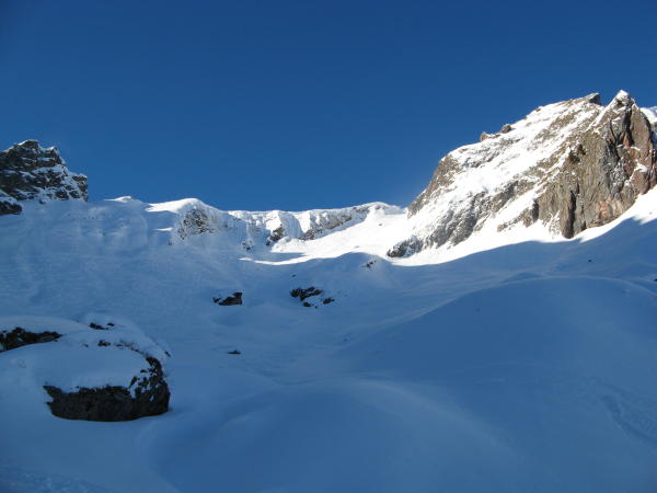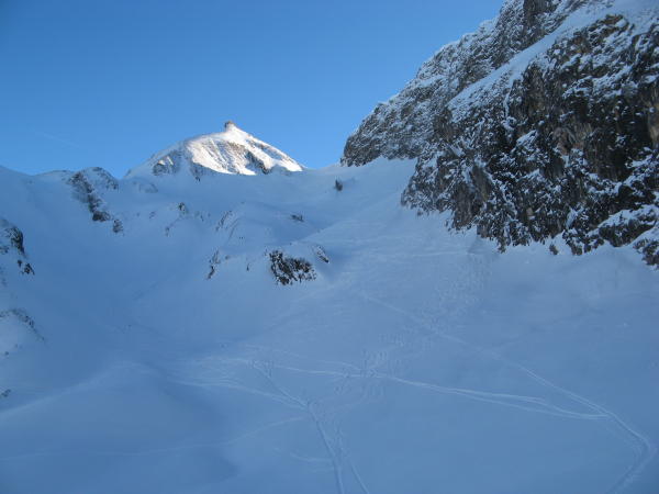 Nur im oberen Teil, wo die Sonne schon früh rein scheint, ist der Schnee entsprechend schwer und schlecht.