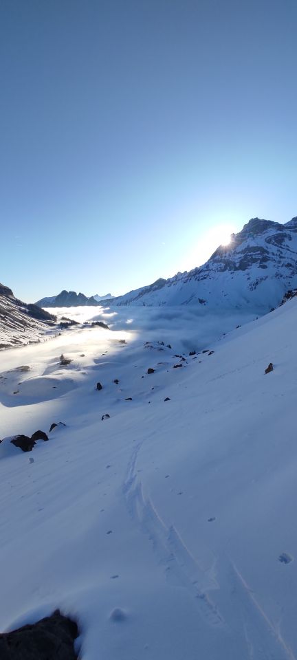 Vom Rotgrätli muss man nach links und dort ca. 50 Hm runter, bevor man den steilen Hang queren kann. Hier brauchts sichere Verhältnisse. Der Schnee ist hier eher hart, je nach dem brauchts Harscheisen. Bei mir hat die Sonne gerade genug aufgeweicht, um ohne zu gehen.