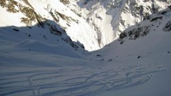 Gletscher: Keine offenen Spalten, jedoch sind die einen vermutlich nur leicht überschneit - besser weiterhin auf der rechten Abfahrtsseite bleiben.