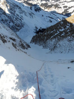 Coulieinstieg braucht min. 60er Seil(unser gem. Führer genügendem 40er hörte in Abstieg auf!),geht auch nur mit Steigeisen und 2 Pickel,Gstältli nicht nötig.Zaunpfosten hät tip top.Bödeli nun geschaufelt für Skianziehen.Abfahrt Hammer:Presspulfer bis unten,Ausfahrt leider leichter Deckel.Da Nami keine Zeit, Aufstieg ab Biresattel zu Bunkerculis gelassen(sahen eben auch noch gut aus heute)und über die noch schön zu fahrenden Hänge der Bire runter.