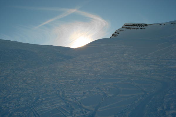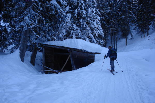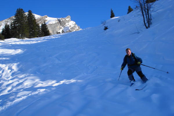 Erstaunlich gute Schneeverhältnisse, meist Pulver auf fester Unterlage. Hat deutlich mehr Schnee als im BO auf gleicher Höhe. Beim Brisenhuis 1754m hat es 50-70cm.