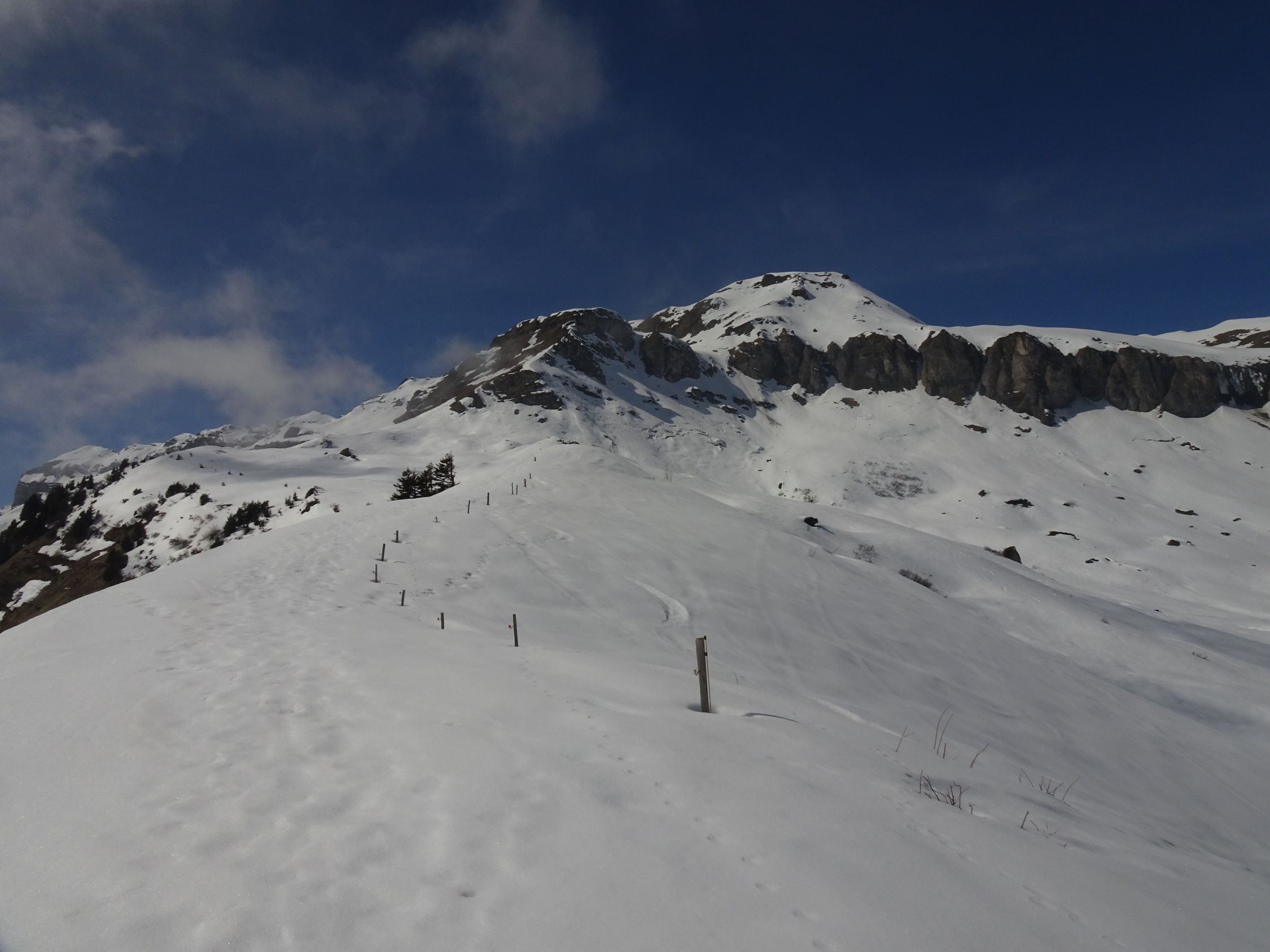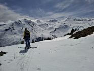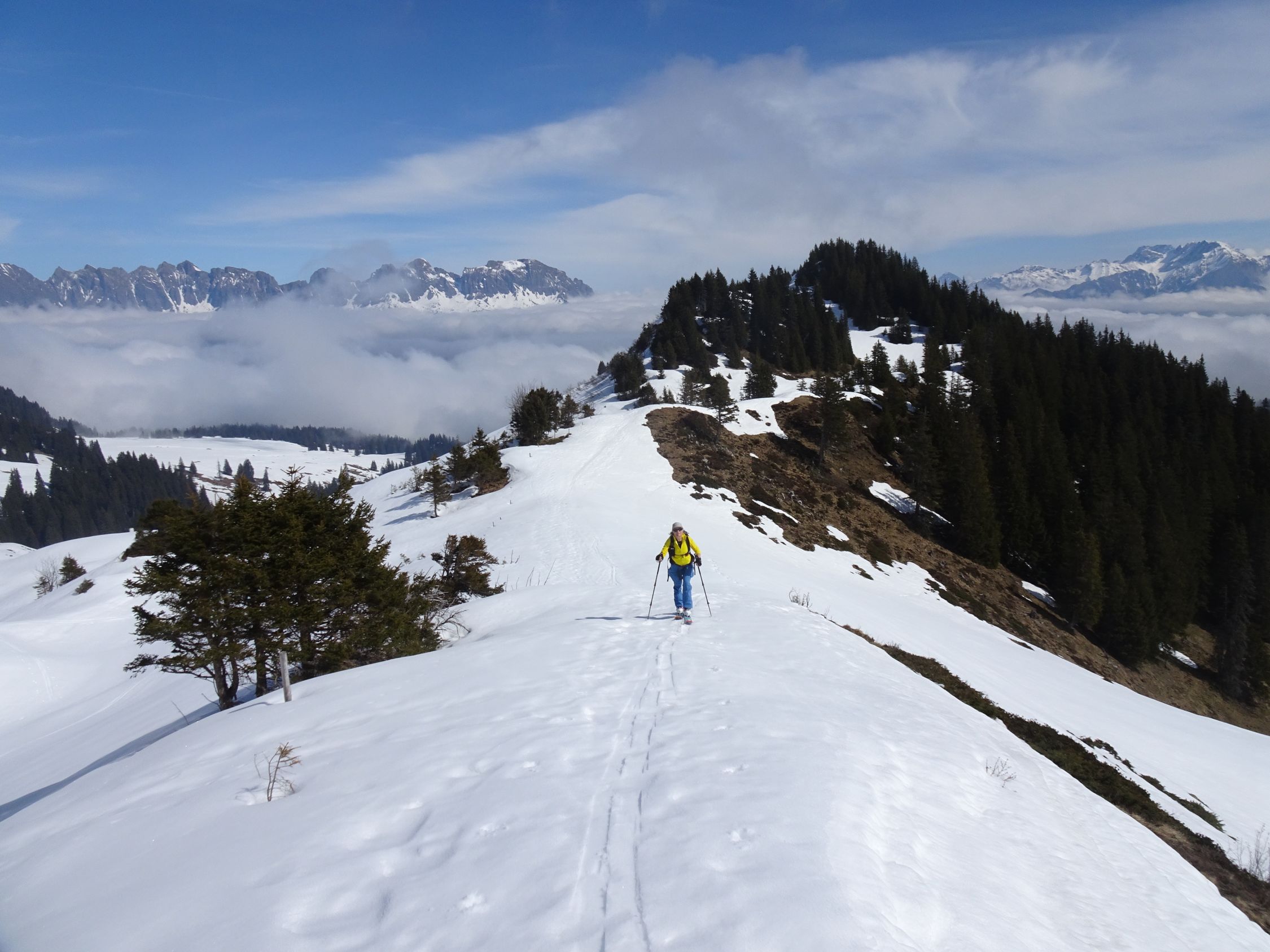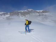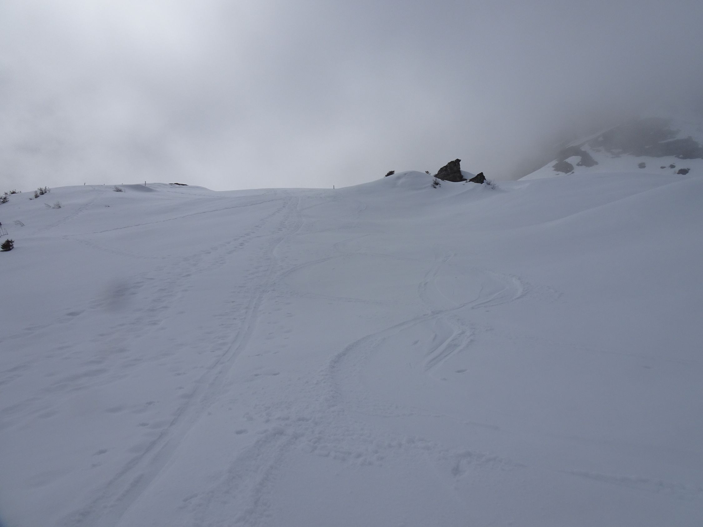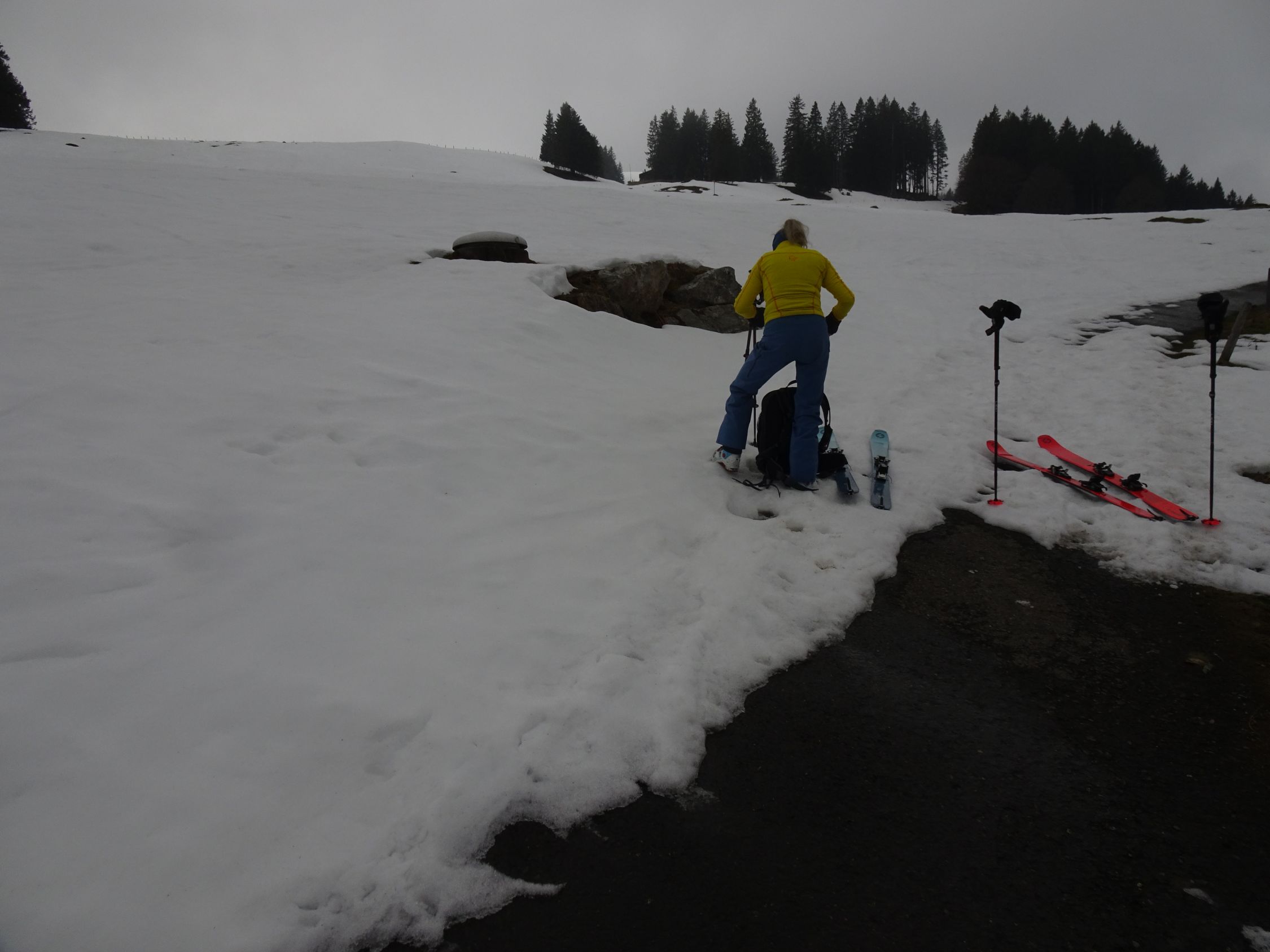 mit dem Auto bis zur Kehre auf 1351m. Dann versperrte eine ca. 30m lange Schneeauflage die Weiterfahrt. Bis ca. 1430m mussten wir dann die Ski tragen. Im Aufstieg wechselten sich Sonne und Nebel ab. Bei der Abfahrt hatten wir nur auf den obersten 100m eine relativ gute Sicht und schöne Sulzverhältnisse. Anschliessen wurde der Nebel sehr dicht und wir konnten keine 5 m weit sehen. Somit tasteten wir uns bis zu Hintersäss runter und fuhren der Strasse entlang ab (schade, bei dem schönen Sulz oben). Weiter unten wurde die Sicht besser und der Schnee schlechter (nass und klebrig)