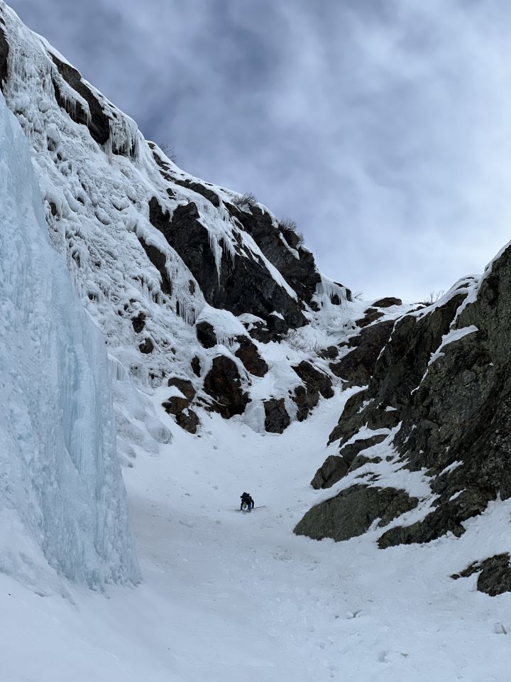 Bis Pkt. 1366 praktisch schneefrei, Winterwanderweg auf andere Bachseite sehr eisig. Bis Einstig Couloir Schnee umgewandeld und durch Wald gut zu gehen, wobei im unteren Teil kurze apere Stellen vorhanden sind. Couloir guter Trittschnee, oben sehr schmall. Achtung, Eisschlag, die Sonne scheint schon sehr früh ins Couloir und somit auch an die Eisfälle. Weiter über Pulverhänge. Gestern ist eine, durch Personen ausgelöst Lawine im Triebschnee kurz unter dem Grat auf 2900m angerissen. Diese ist beängstigen weit geflossen (bis ca. 2600m), darum dann umgekehrt. Neben dem Triebschnee sollte die Mitreissgefahr beachtet werden.