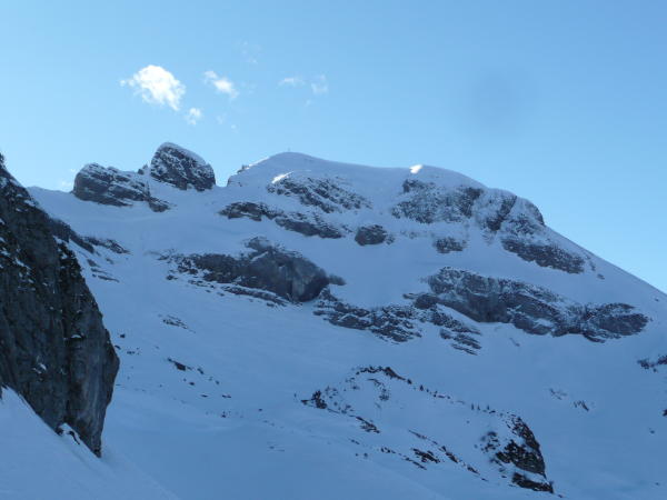 Es hat noch genügend Schnee von unten an. Heute sehr warme Temperaturen und in der Gipfelregion windig. Schnee nass und nicht mehr tragend.