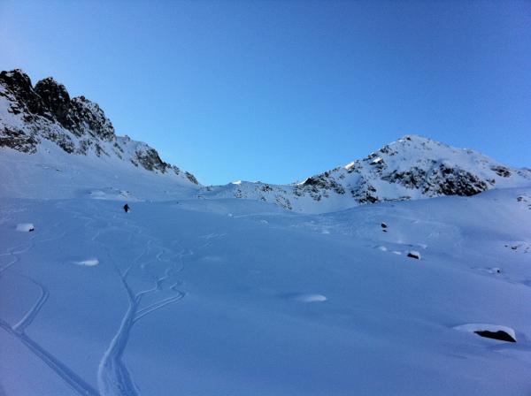Für die momentane Schneelage sehr gut und ohne Steinkontakte durchgekommen. Die Nordhänge warteten mit super Pulver auf, wo sogar noch schöne unverfahrene Linien gefunden werden konnten.