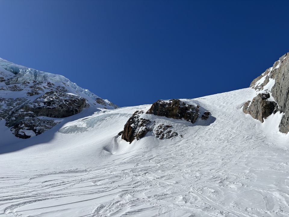Ab Hotel Steingletscher viel Schnee, Gletscher ist gut eingeschneit, Steilstufe mit Ski machbar oder hoch laufen, keine Steigeisen notwendig.