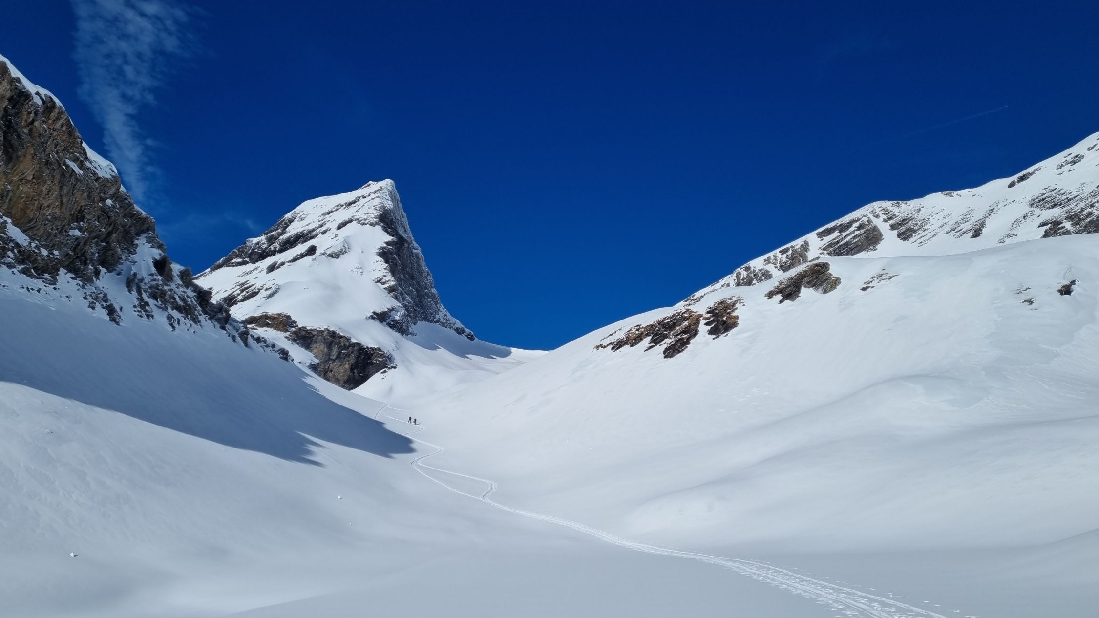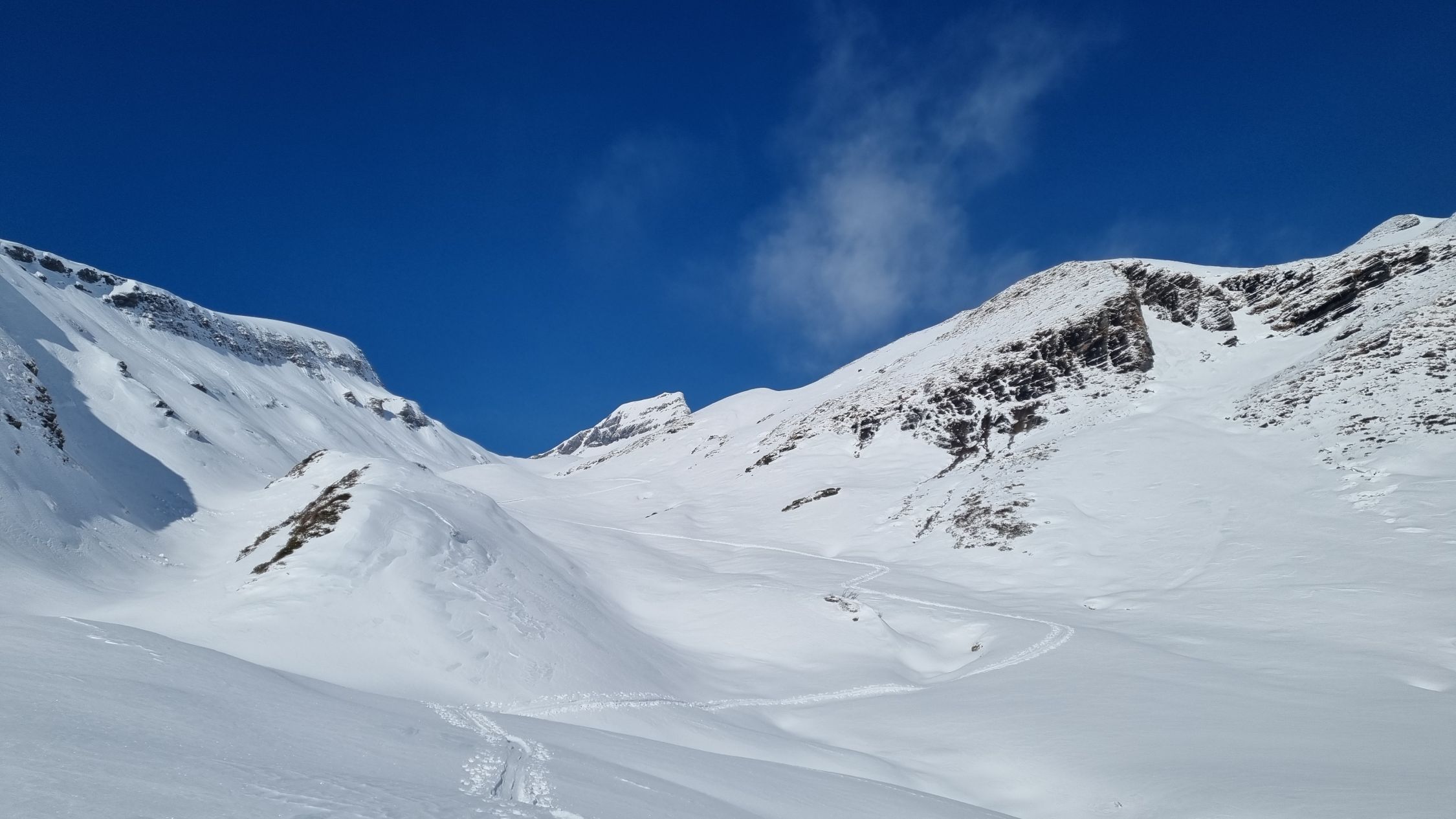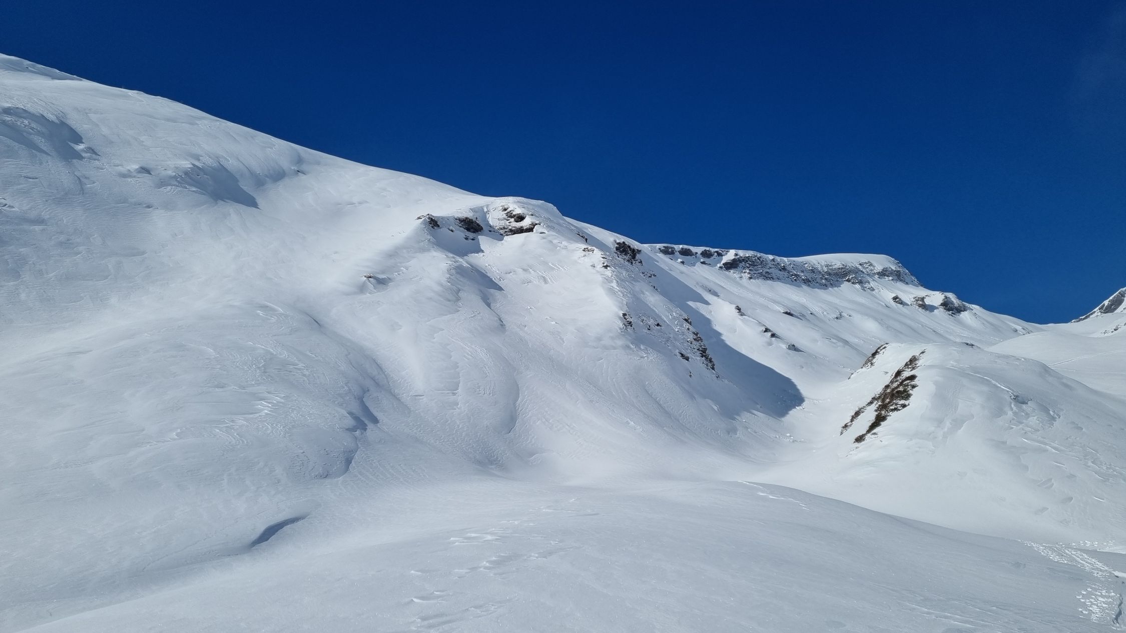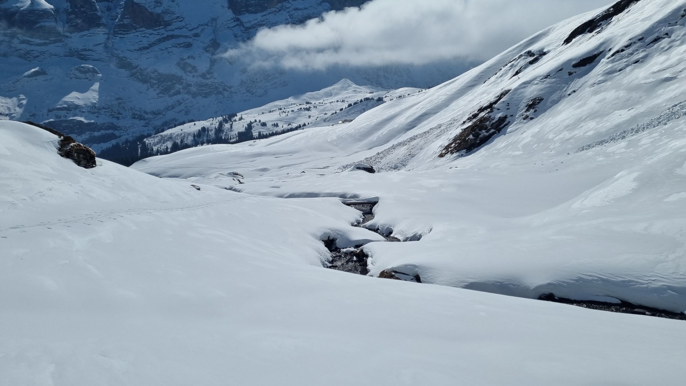 In der Abfahrt vom Gipfelhang gilt es, den fiesen Steinen auszuweichen. Das geht einigermassen gut, bis kurz oberhalb Wart, wo man es nicht mehr erwartet. Danach via Wyschbääch runter. Oben je nach Exposition schwerer Pulver, feuchter Pulver, oder ein Winddeckel. Nach unten immer feuchter. Alles aber gut zu fahren.