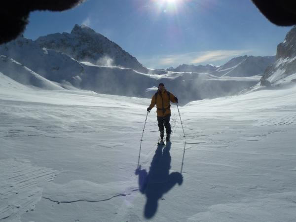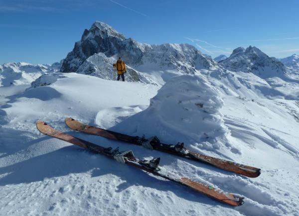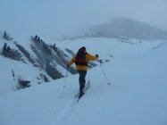 Schneeverhältnisse ansprechend, gut eingeschneit, ausser am Gipfelhang abgeblasen, glasige Windganglien und steinig.