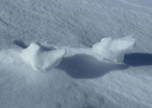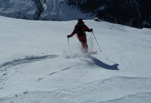 Auf der Abfahrt vornehmlich windgepresster Pulverschnee.
