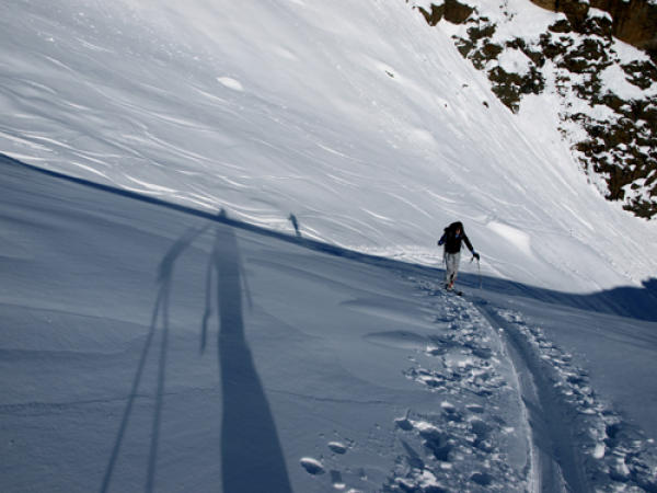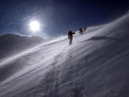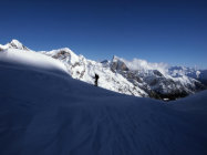 Harschdeckel bis ca 2500m danach in weiten Bereichen windverpresst, wenig Pulver. In den Gräben teilweise beträchtliche Triebschneeansammlungen. Abfahrt stellenweise recht rustikal.