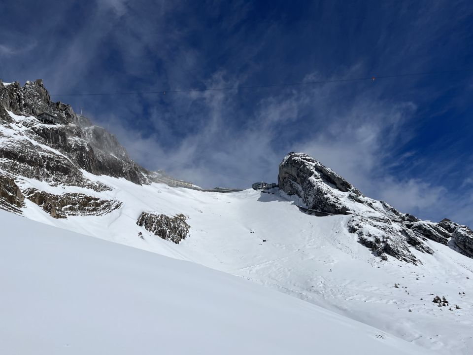 Ab Fräkmunt können die Schneeschuhe montiert werden. Schnee teilweise gefroren mit Deckel, Sonnenhänge schon am Morgen weich aber gut zu laufen. Ab Mittag sulzig.