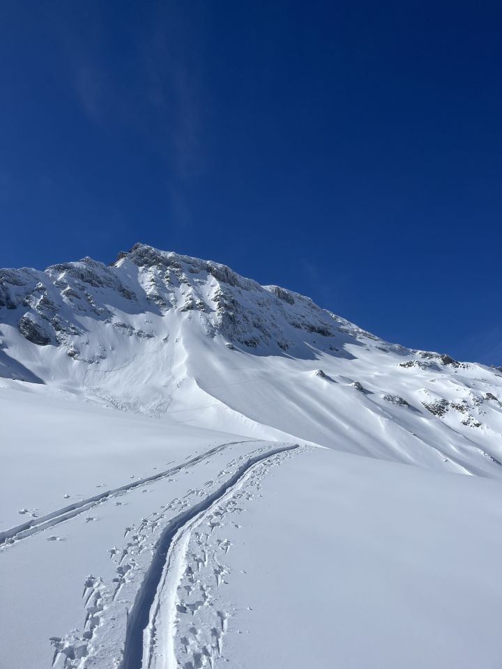 Später Start bei Bergstation Dossenlift. Gute Spur über die AHV Route bei +15 cm Pulverschnee von gestern bis zum Frühstücksplatz. Bei der Schlüsselstelle kurz Ski getragen. Vom Frühstücksplatz bei guten Verhältnissen und Spur auf den Gipfel.