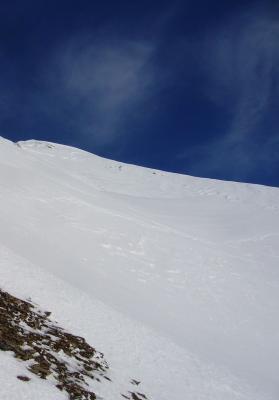 Passstraße abgeblasen und hart. In Val Corno eine Mischung aus Zastrugis, Harsch und Winddeckel. In den abzweigenden Nordhängen windgepresster Pulverschnee. Überall im Gebiet deutliche Spuren von Windverfrachtung: Wächten, alte Schneebrettlawinen, etc. Im Gipfelhang befanden sich Abrisspuren von einigen Schneebrettern. Unterhalb 2/3 Höhe liegt ein neues riesiges Triebschneepaket (siehe Bild). Deshalb war die Scharte Umkehrpunkt. Ein Felsaufstieg wurde nach wenigen abgebrochen, da die Felsen abschüssig und der Schnee haltlos war.