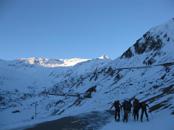 Wenig Schnee, aber es reicht. Bei der Abfahrt nach Nätschen fanden wir oben noch Pulverschnee, dann wenig Bruchharsch, unten schon fast Frühjahrsfirn.