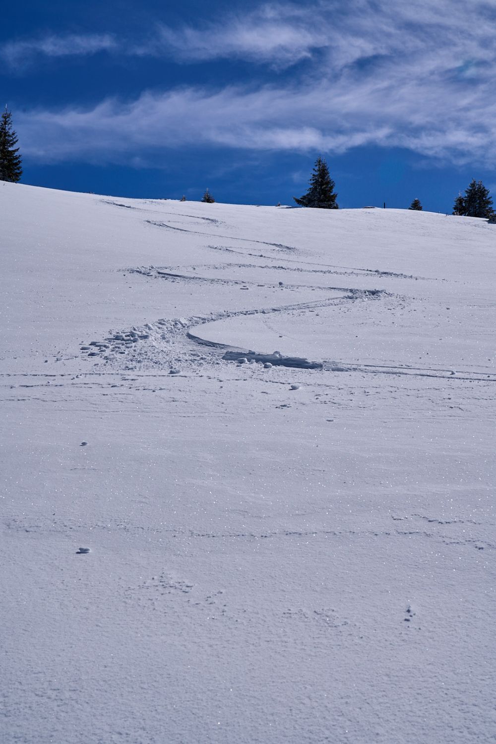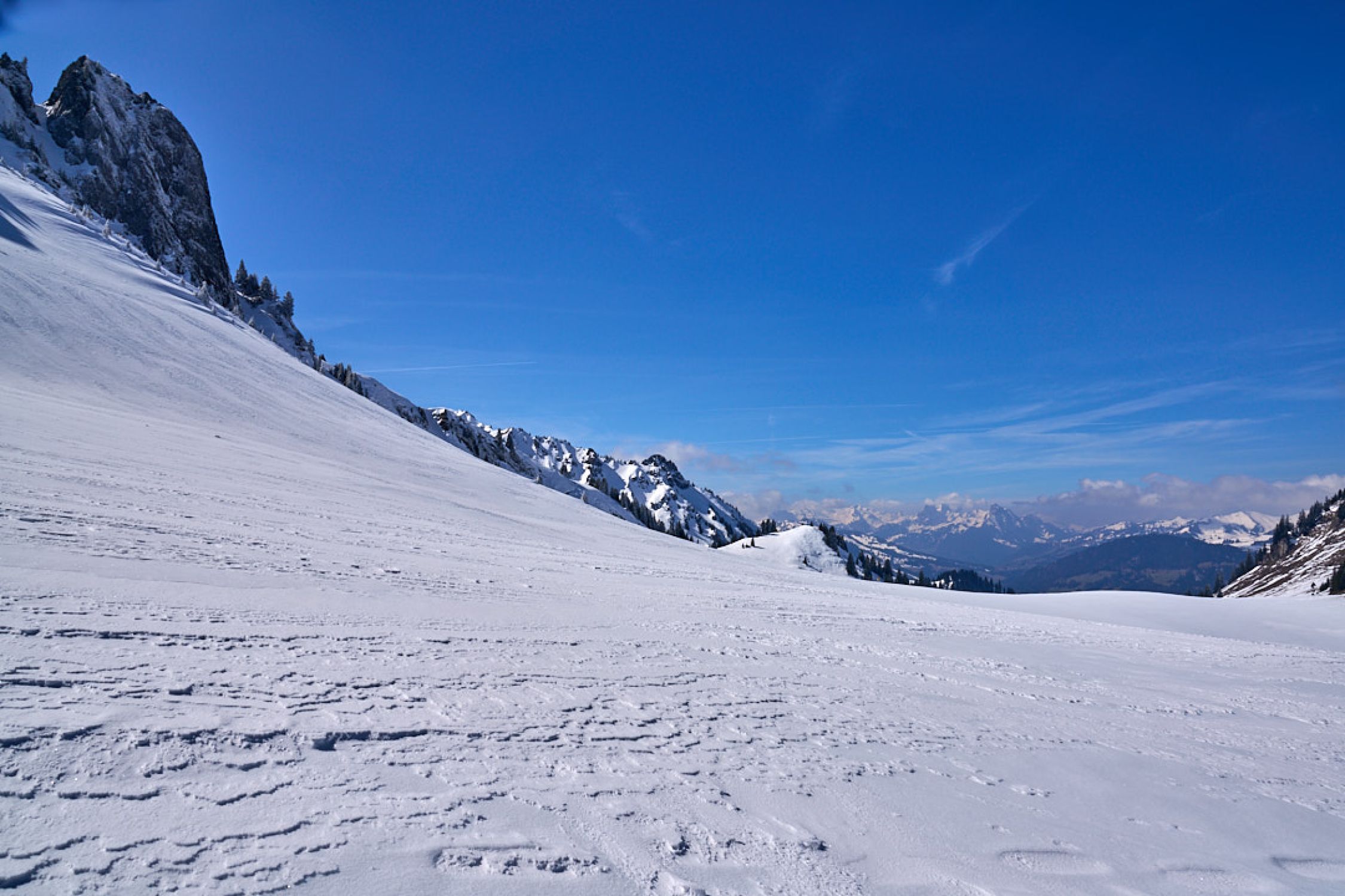 War heute der einzige auf dem Puur. Die meisten waren am Niederhorn unterwegs. Abfahrt: Gipfelhang sehr schön zum fahren.