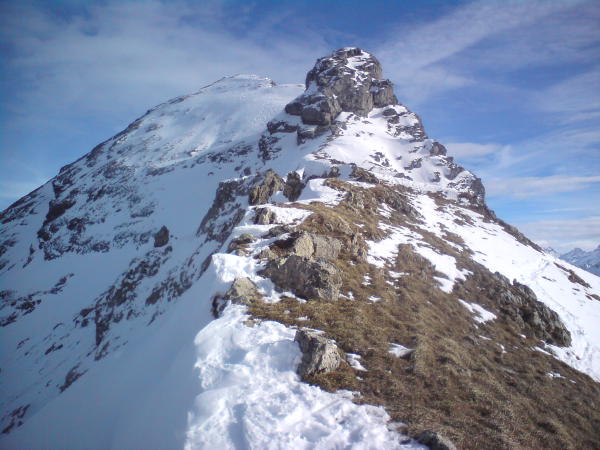 Parkplatz eine einzige Eisbahn, Strasse eisig jedoch gut zu gehen. Ab Wildgrimmi dann jegliche Arten von Schnee. Windgepresst bis Pulver noch alles zu finden. Da jedoch eine harte Unterlage gut zu fahren. Der Verbindungsgrat hat kaum noch Schnee. Ging zu Fuss. Im Gipfelhang gut Spur. Bis auf den Gipfel mit den Skis. Bei der Abfahrt keinen Steinkontakt.