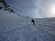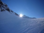 Gut verfestigte Schneedecke. Vorwiegend Bruchharsch. Gipfelhang sehr harter Schnee. Auf der Abfahrt in nord exponierten Mulden Pulver.