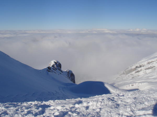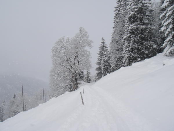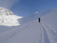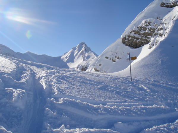 Von Niderrickenbach bis oberhalb des Brisenhuis Nebel und starker Schneefall, ab ca. 1900 m anschliessend Uebergang zur Sonne - von da an auch saukalt! Oben ca. 50 cm lockerer Pulverschnee, keine Windverfrachtungen, aber schon stark zerfahren.