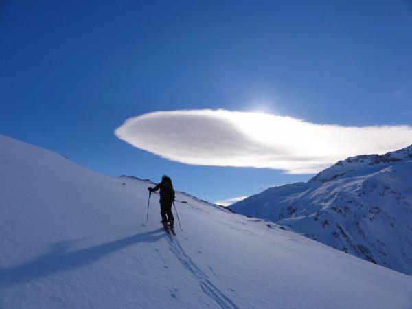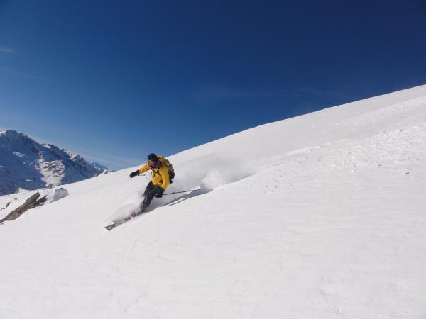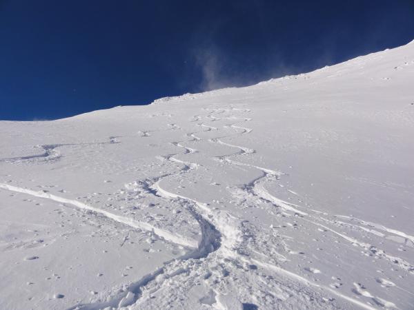 Im Val Cristalina fast kein Schnee, nur ganz knapp konnten wir den Fahrweg hinein fellnen. Mit zunehmender Höhe auch immer mehr Schnee, meistens auf einer sehr harten Unterlage. Ab ca. 2500 ca. 20cm Pulverschnee, teilweise hartgepresst. Im Unterenteil wären Harscheisen von Vorteil gewesen.