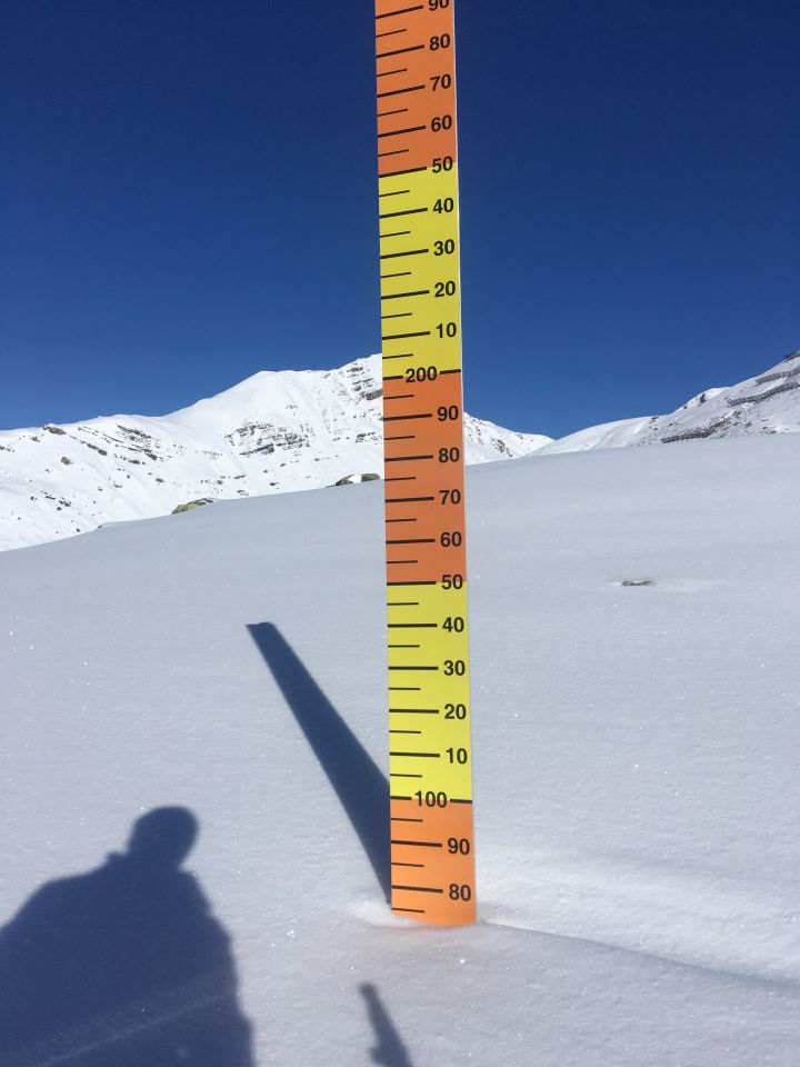 Aufstieg auf meist harter unterlage mit ca.5 cm NS. Ab 2800 verblasen, starke Bise! Gipfel nur zu Fuß machbar, dünne Schneeschicht, viel blanke Stellen. Bei Abfahrt Vorsicht geboten, ab und zu bleibt man am Steine hängen. Zur schneelage s Bild Messlatte am Pass!