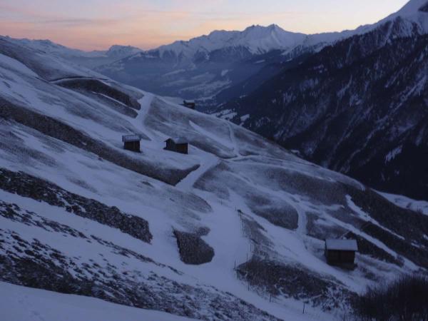 Abenteuertour, für alte Ski. Abfahrt zur Alp Cavel überraschend lohnend, mit nur kurzen Schiebestücken, und einer kleinen Tragepassage.