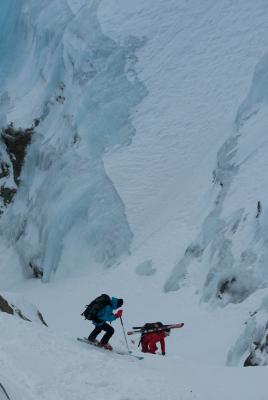 Abfahrt oben ziemlich harter Schnee. Mittlerer Bereich z.T. windgefestigt mit einem "Deckel", manchmal schwach, manchmal etwas härter, zeitweise sogar pulvriger Schnee. Giovanelli-Couloir dank Spuren vom Hüttenwart (DANKE!) gut gefunden. Verhältnisse im Couloir sehr gut. Ohne Seil machbar. Für sichere Skifahrer ganz mit Skis machbar. Für andere: Eine Stufe im mittleren Teil des Couloirs evtl. zu Fuss überwinden.