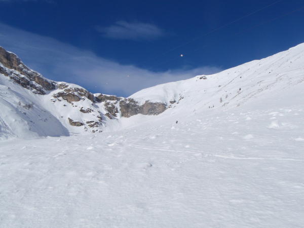 Der Schnee war nur teilweise windgepresst, vielfach noch Pulver. Für mehr als 1 Woche ohne Schneefall einwandfreie Verhältnisse.