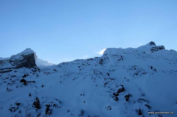 Lokale starke Verwehungen. Kleines Schneebrett an einer steilen Kuppe.