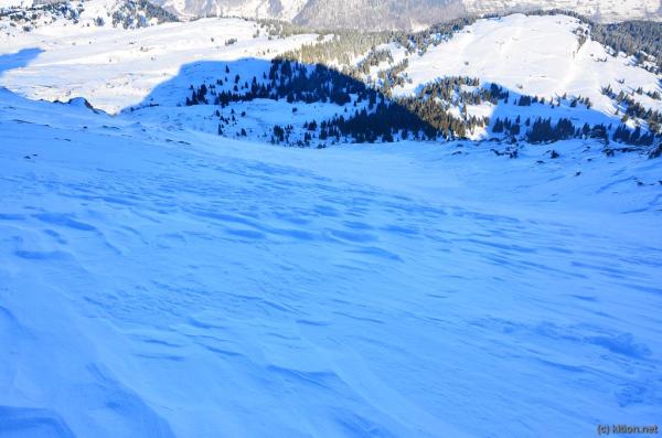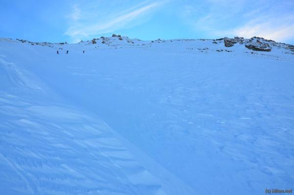 In den meisten Hängen stark windbearbeitet: zum Teil stark windgepresster Pulver, zum Teil total vereist - und das alles ändert häufig von Meter zu Meter.