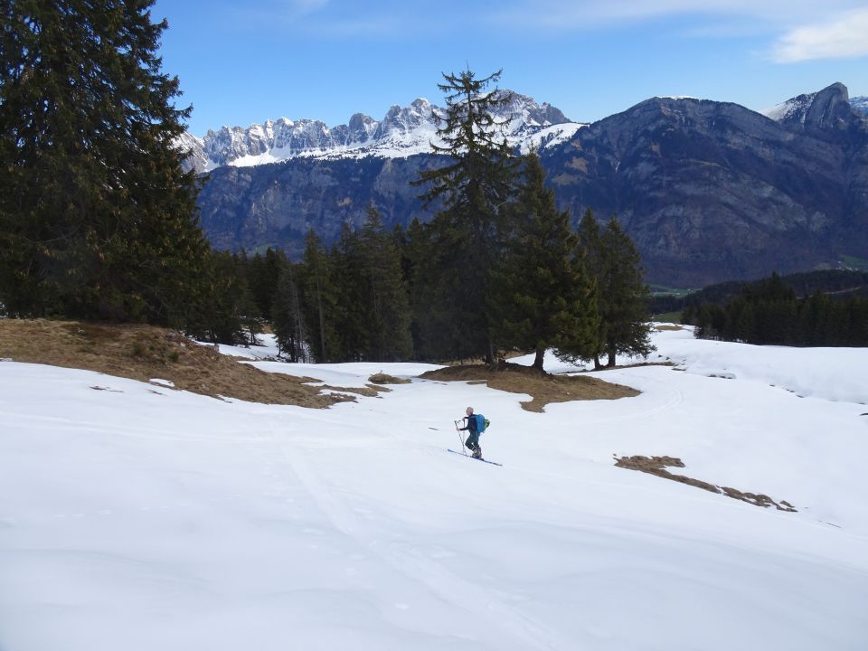 mit dem Auto konnten wir bis auf ca. 1320m fahren. Dort konnten die Skis montiert werden und mussten, trotz zahlreicher aperer Stellen an den unteren Hängen, nicht mehr abgeschnallt werden. Auf einer harten Oberfläche, war ca. 1cm weicher Schnee - also gut zu gehen. Alte Spuren waren fast nicht mehr zu erkennen. Anfangs war es noch ziemlich bewölkt; im späteren Verlauf zeigte sich jedoch die Sonne. Wir starteten die Abfahrt um ca. 13 Uhr. In der Mulde vom Hüenerisattel war frischer Pulverschnee; dann schöner Sulz, später etwas Bremsschnee und dann wieder Sulz bis zum Auto