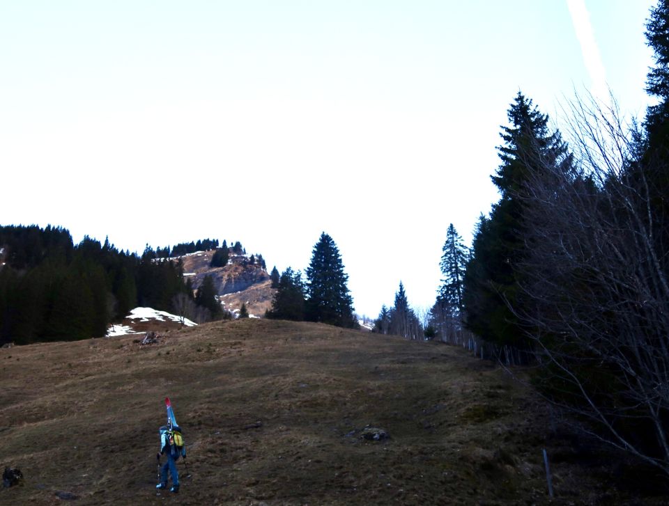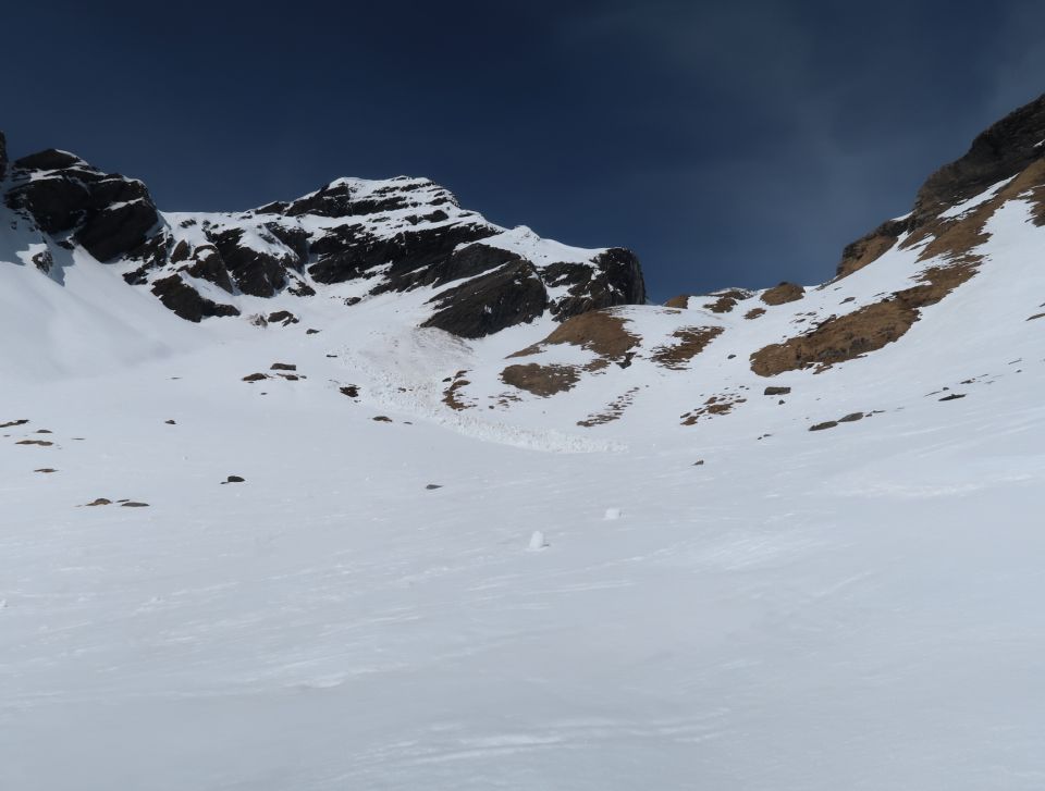 30-40 Min Skitragen bis zum Schnee lohnt sich, dann super Verhältnisse bis in den Sattel, Gipfelhang steinig, kann zu Fuss gemacht werden. Abfahrt durch das Wischbächital um 12 Uhr spätestens, Noch Schnee bis zum Parkplatz Schwarzwaldalp