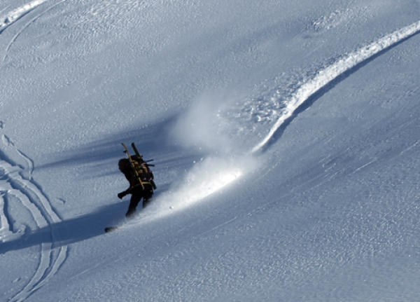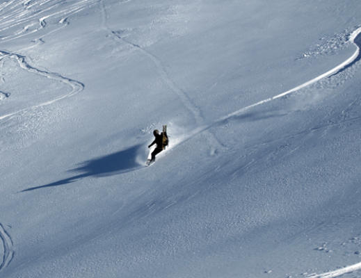 Gipfel abgeweht und nicht durchgehend befahrbar. Alte Ski oder Board (mehr Auftrieb)empfehlenswert.