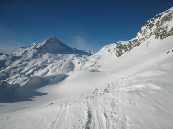 Genügend Schnee, von Pulver über Bruchharst war alles anzutreffen. Mehrheitlich aber nicht besonders schöne Verhältnisse. Sehr kalt und auf dem Gipfel viel Wind.