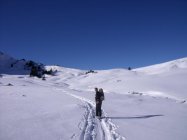 Verhältnisse im Aufstieg bis zum Gipfelhang noch sehr gut. Gipfelhang ist südseitig und teilweise kommen schon größere Grassfelder raus. Steinkontakt unvermeidbar. Nach Gipfelhang Abfahrt bis in Tal gut fahrbar im leichten Sulz. Unterer Teil hat eher mehr Schnee als die oberen Lagen. Unten ca. 20 cm Pulver auf sehr harter Unterlage aber spassig zu fahren.