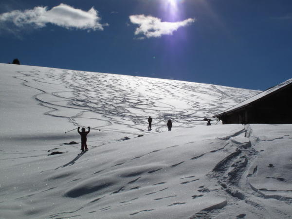 Insgesamt liegt nur wenig Schnee. Auf gefrorener Unterlage findet sich ein herrliches Pülverchen von ca. 10 cm. So konnten auch die jüngsten Teilnehmer (5 und 7 Jahre!) ihre Spuren ziehen und hatten sichtlich Freude dran (die älteren natürlich auch!). Abfahrt im unteren Teil auf der Strasse problemlos möglich.