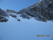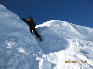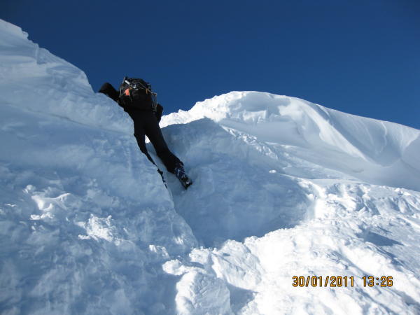 Auf der ganzen Route gute Verhältnisse und bei gutem technischen Können ist auch das Felsband problemlos passierbar. Im Abstieg geben da leichte Steigeisen Sicherheit.
