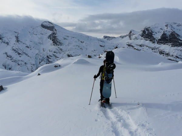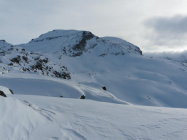Der Steilhang gegenüber der Länta Hütte ist gut verfestigt und war im Aufstieg auch mit Schneeschuhen gut zu meistern.